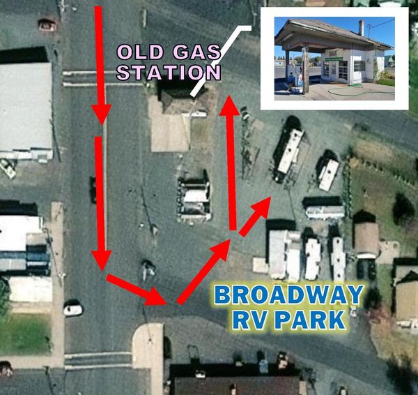 If entering Malin eastbound from Hwy 50, follow the rightward curve of the highway into town, which becomes the main street (“Broadway”), and just after you pass the Old Gas Station turn left on Lakeview Ave., which serves as the entrance to the RV Park. It is relatively easy to make a counter-clockwise loop around the Old Gas Station if you wish to first stop on the lane to orient yourself before entering the site at the optimum angle.