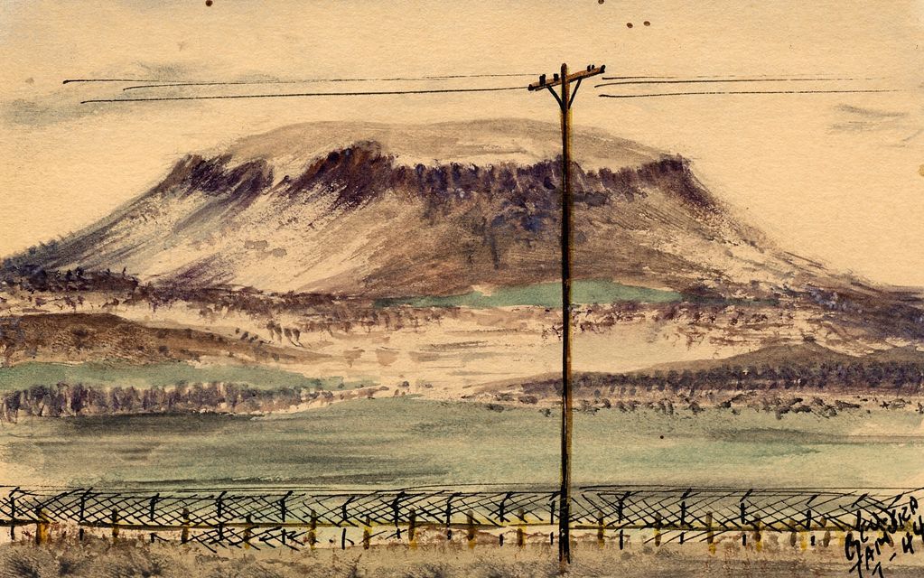 "Abalone Hill" - better known as Horse Mountain. This is a sumi (ink wash technique) watercolor by the late artist George Tamura, painted from inside the fence at the Tule Lake Segregation Center in 1944 when he was 16 years old. Courtesy of the National Park Service.