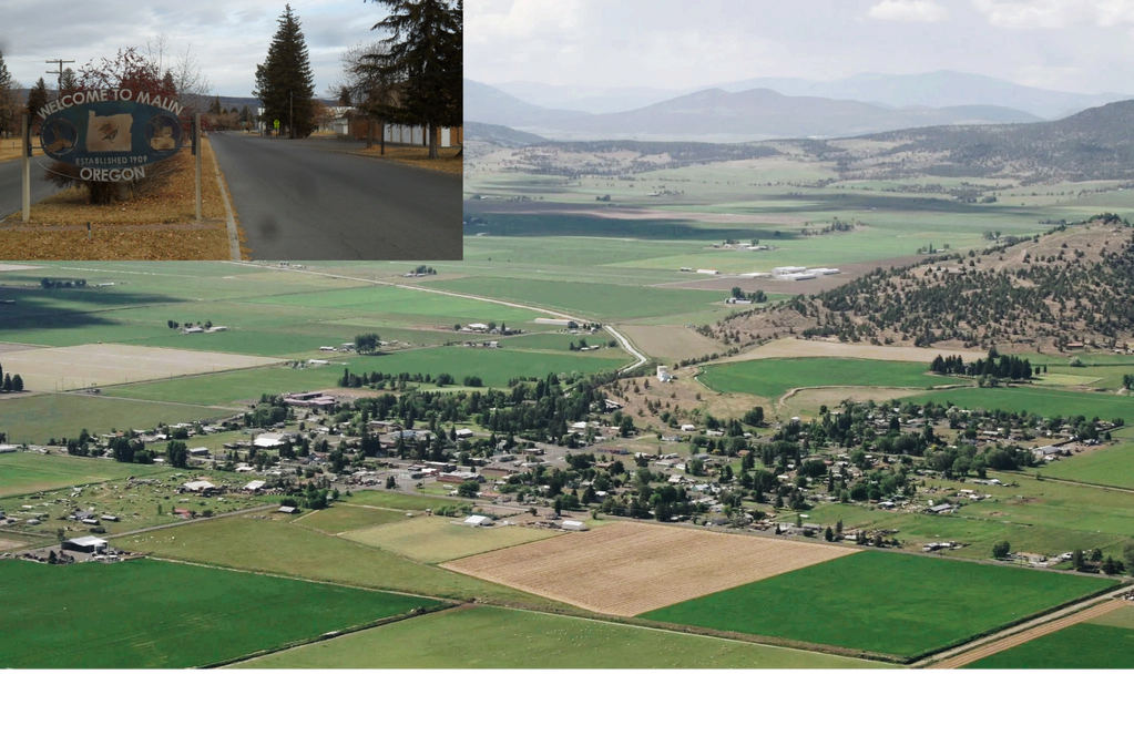 Fly-over photo of Malin looking northwest and welcome sign at entrance to town along Highway 50 (inset).