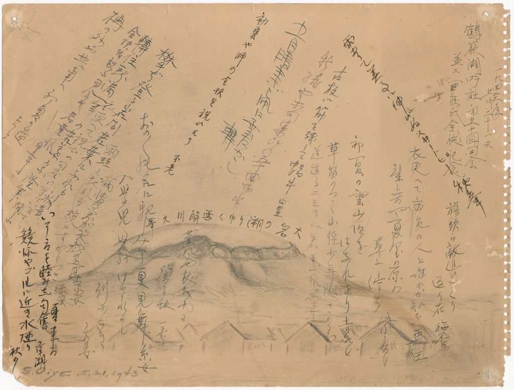A sketch of Abalone Hill which - together with "Castle Rock" (The Peninsula) - served as prominent landmarks and focal points for the Japanese-Americans interned at the Camp. Courtesy of the Shizuko and Shigenori Oiye Collection, Densho Digital Repository.